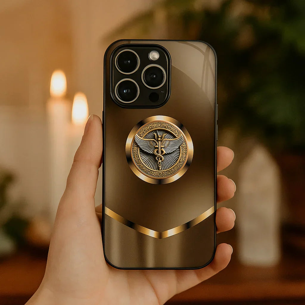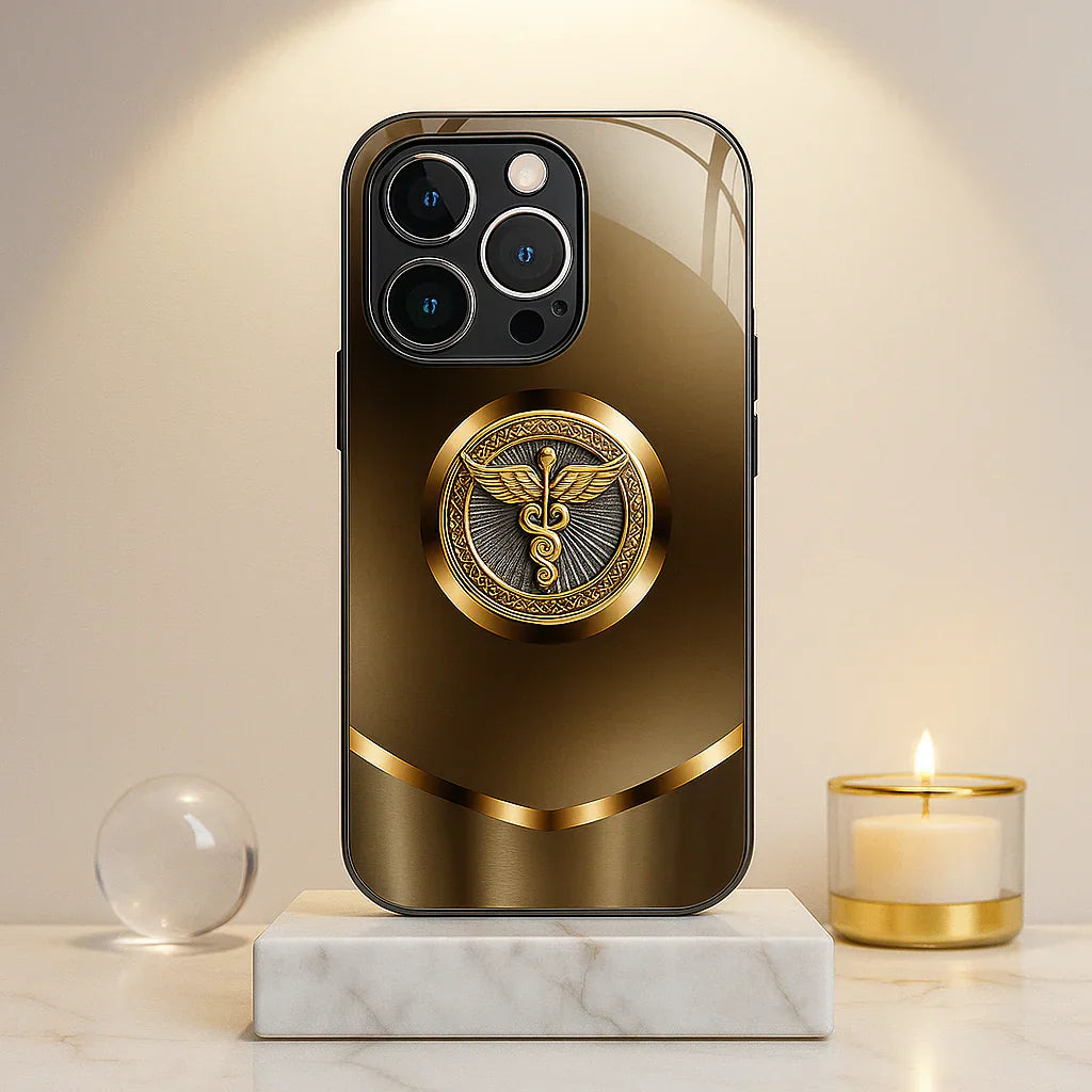 Crafted for those who value sophistication and purpose, this premium glass case features a golden caduceus medallion set against a frosted gradient finish, symbolizing healing and prestige. The tempered glass back adds a touch of elegance while offering scratch resistance and durability. A reinforced shockproof frame ensures protection without compromising style, making it the perfect blend of luxury and functionality.